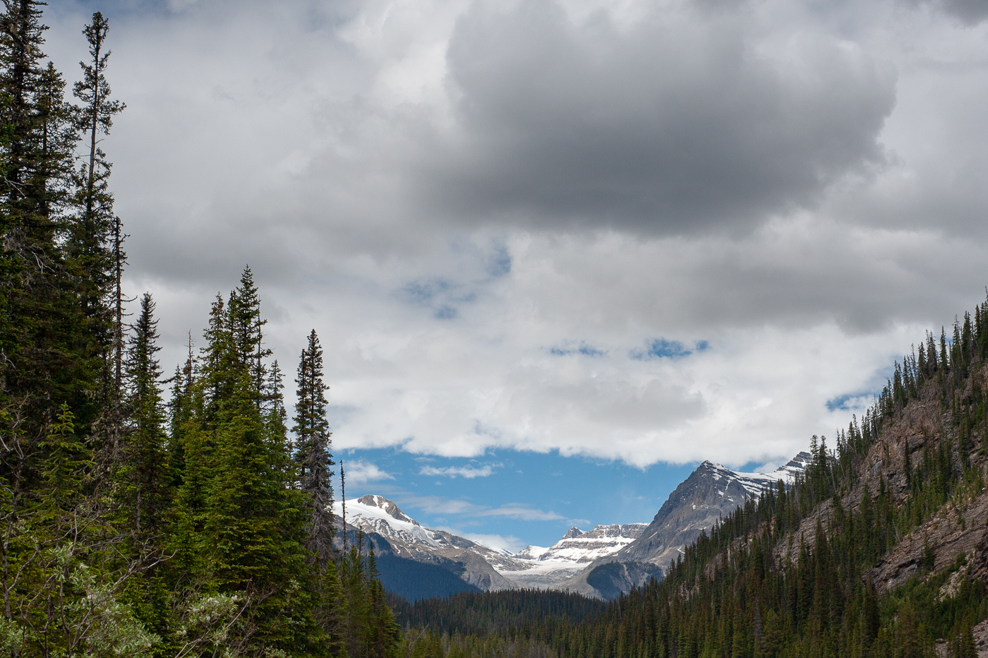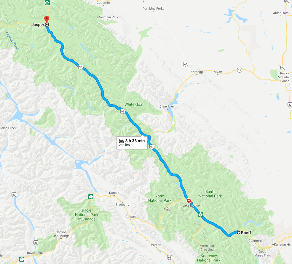 Travelling from Banff to Jasper involves driving along the Icefields Parkway - a road with spectacular mountain views along its length.