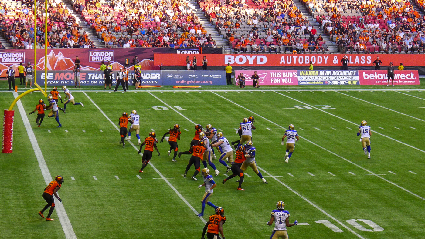 BC Lions (the local team) don't have a great reputation so we weren't expecting them to win. Sure enough at half time, they were 17-nil down.