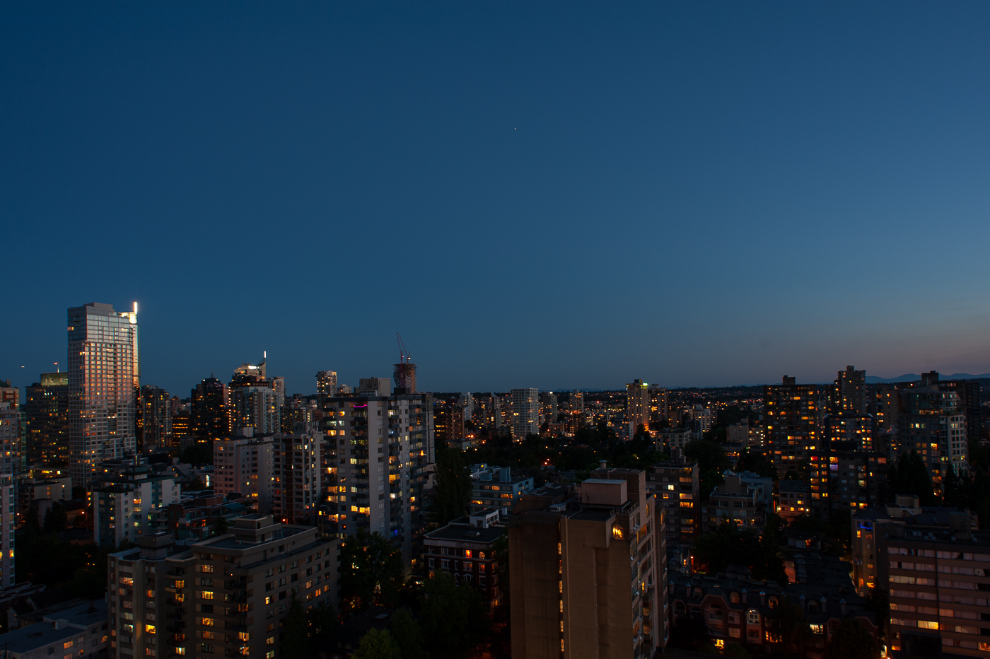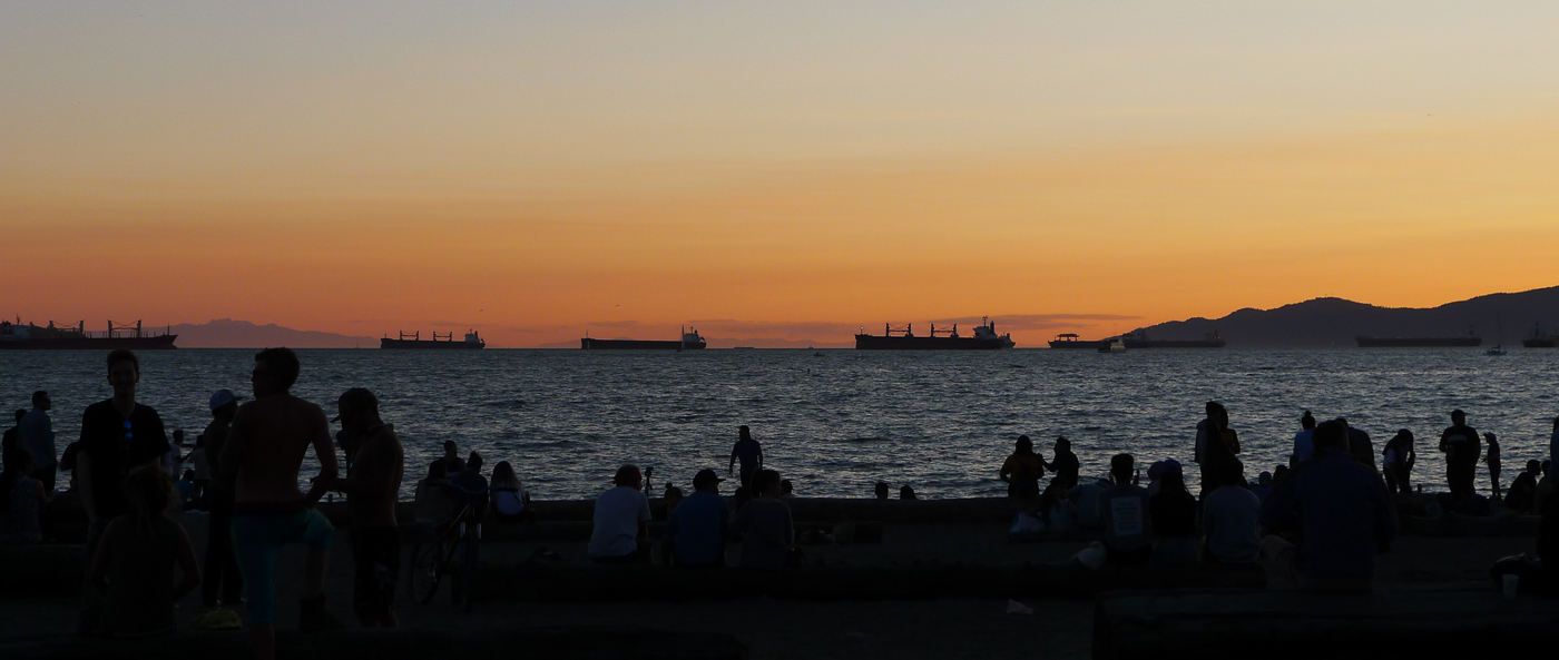 In the evening, we walked to English Bay - the trendy bit of Vancouver. The beach remained busy even as the sun set. Shame about the ever-present oil tankers in the background again.